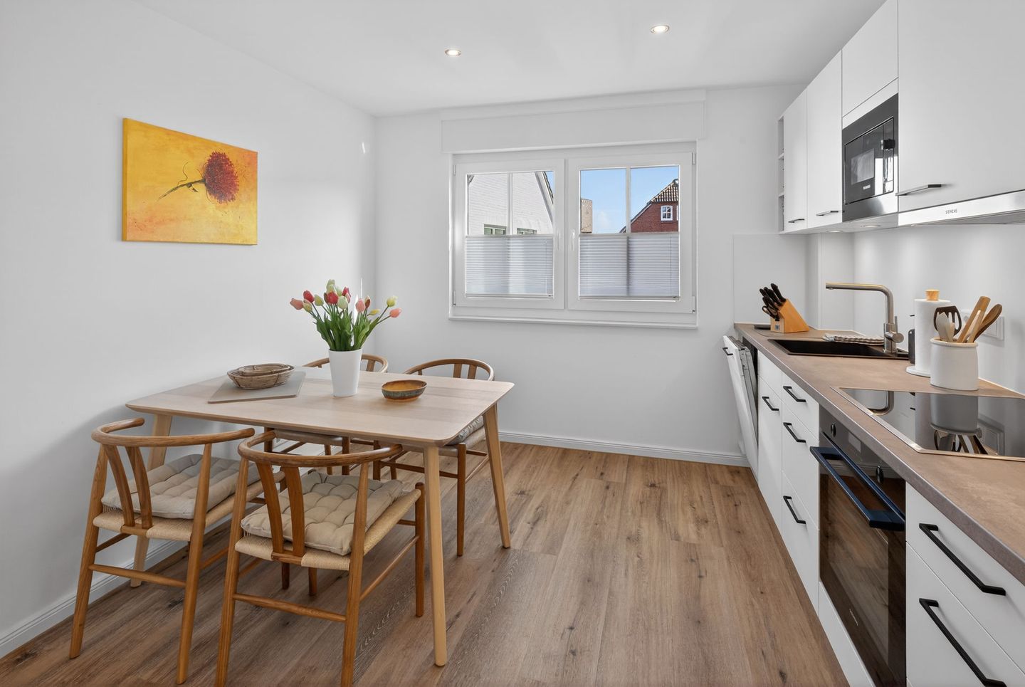 Die geschlossene Küche ist komplett ausgestattet und ermöglicht Ihnen eine unkomplizierte Selbstversorgung. Zur Verfügung stehen Cerankochfeld, Backofen, Mikrowelle, Kühlschrank, Spülmaschine, Wasserkocher, Toaster und Kaffeemaschine. Geschirr, Besteck, Küchenutensilien, Geschirrhandtücher.