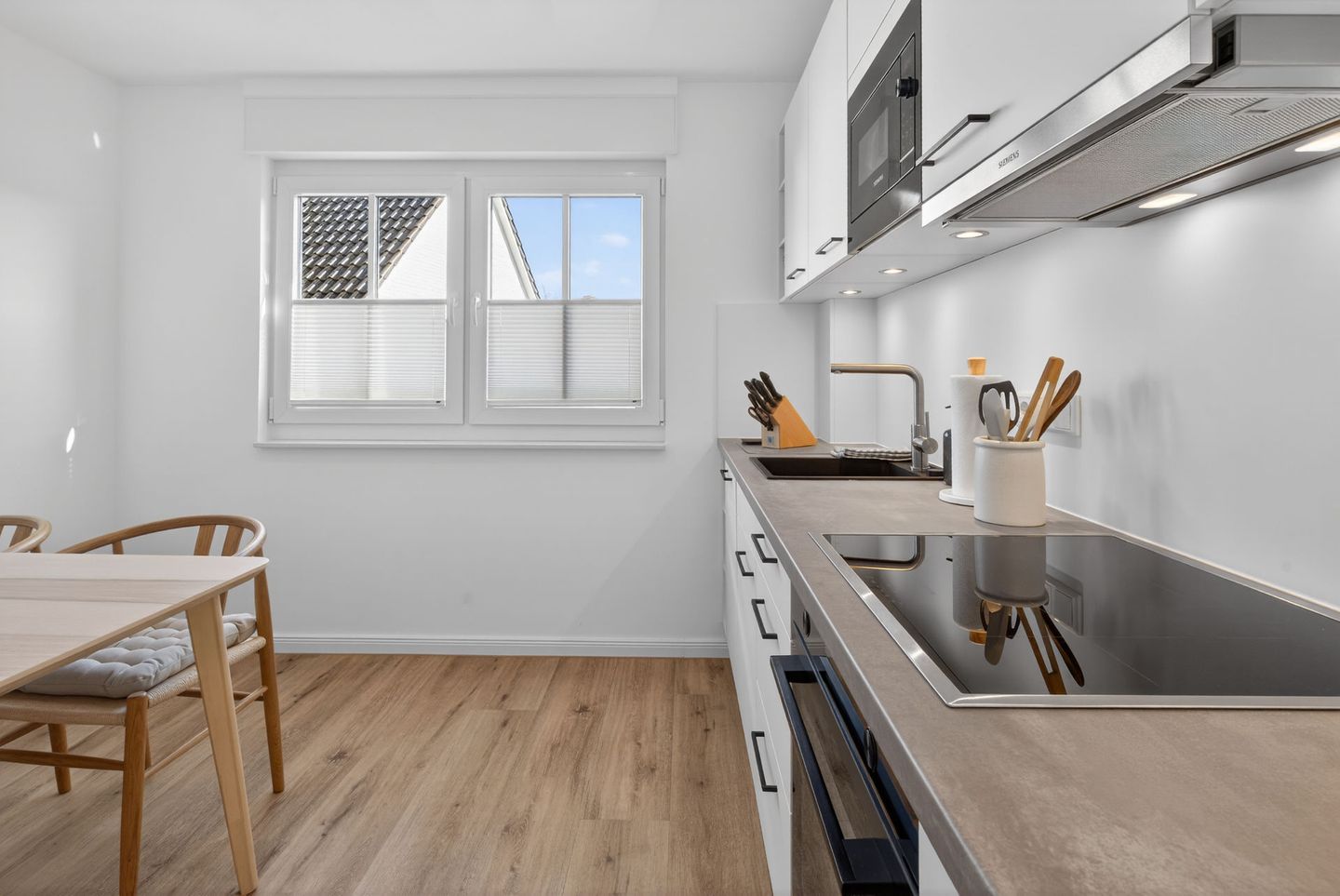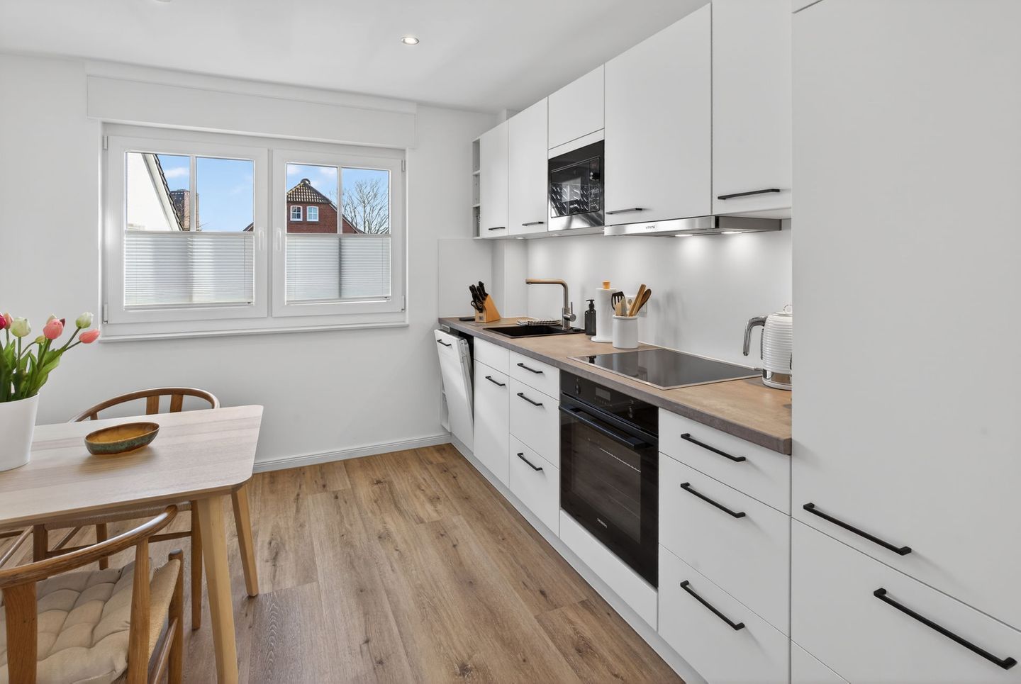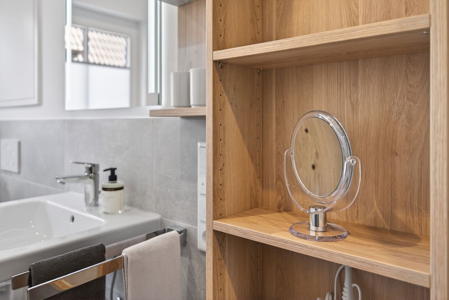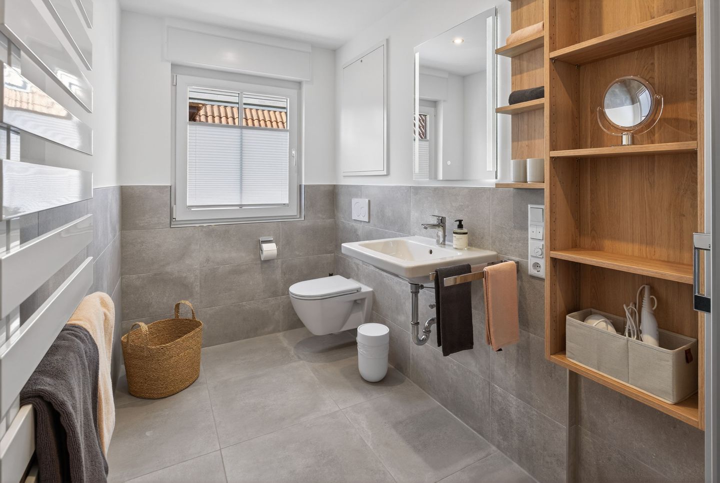 Das Badezimmer verfügt über eine bodengleiche Dusche, WC, Waschbecken, Spiegel, Kosmetikspiegel, Fenster und Haartrockner. Bettwäsche und Handtücher sind inklusive, sodass Sie Ihren Aufenthalt von Anfang an entspannt beginnen können. Ein Wäscheständer, Staubsauger und weitere praktische Details ergänzen die Ausstattung.