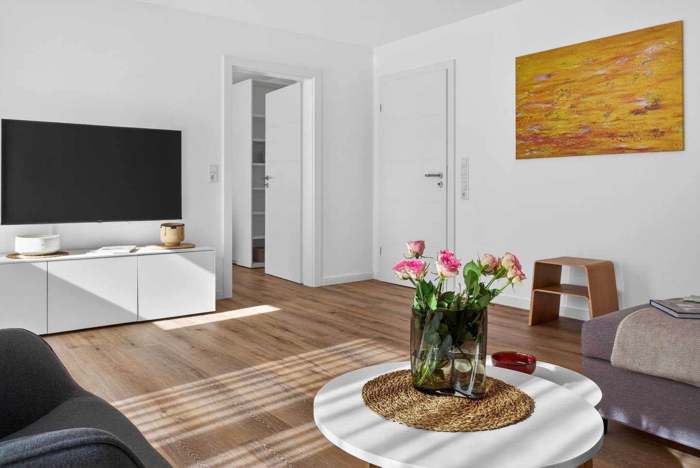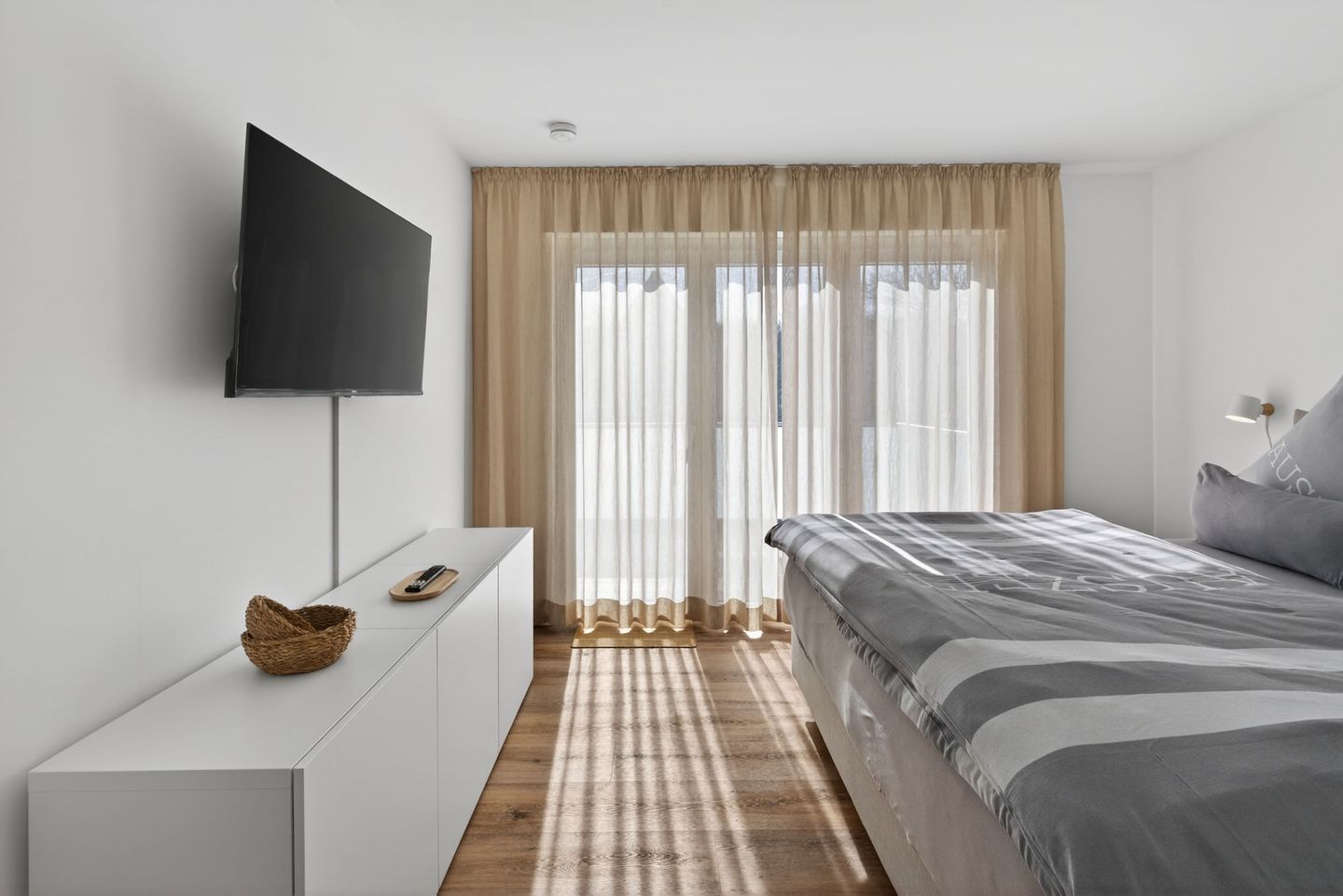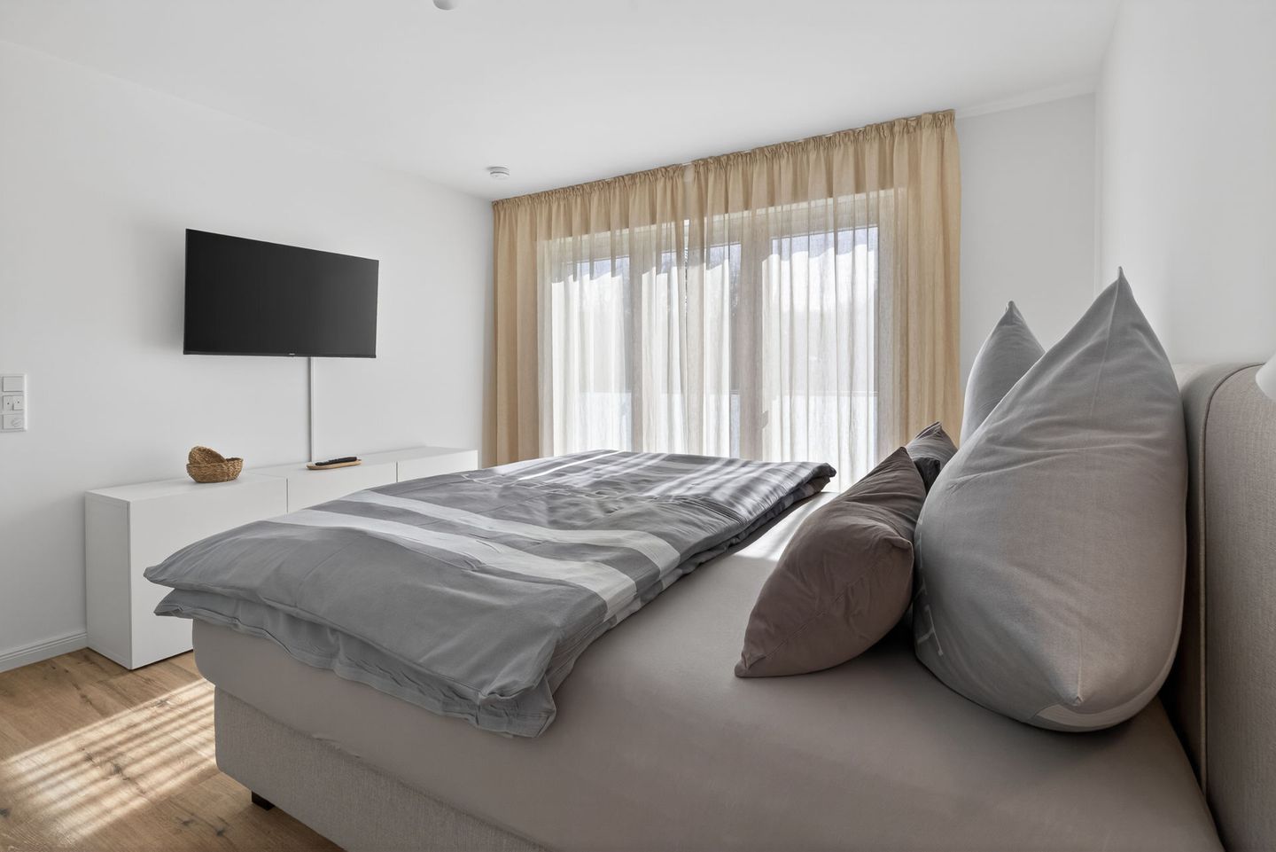 Im Wohnbereich sorgen Sofa, Sessel, Kommode, Garderobe und Esstisch für eine gemütliche und angenehme Atmosphäre. Zwei Fernseher mit digitalem Satellitenanschluss sowie WLAN und Internet stehen Ihnen ebenfalls zur Verfügung. Die Fußbodenheizung tragen in jeder Jahreszeit zu einem angenehmen Wohnklima bei. Vinylböden im Wohn- und Schlafbereich, Sichtschutz an allen Fenstern unterstreichen den gepflegten und wohnlichen Charakter.