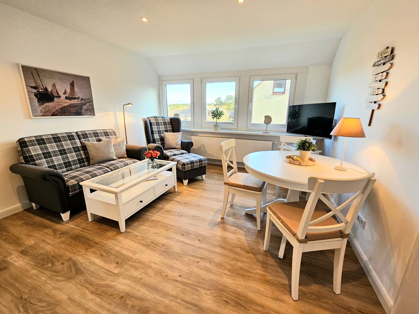 Im hellen Wohnbereich finden Sie gemütliche Sitzgelegenheiten mit Sofa und Sessel sowie einen Esstisch, an dem Sie gemeinsam Mahlzeiten einnehmen können. Die offen in das Wohnzimmer integrierte Küche ist funktional ausgestattet: Ceranherd, Backofen, Kühlschrank, Kaffeemaschine, Toaster, Wasserkocher sowie ausreichend Küchenutensilien, Geschirr und Besteck stehen Ihnen zur Verfügung. Auch Geschirrhandtücher gehören zur Erstausstattung. Damit ist die Zubereitung frischer Inselspezialitäten ein Vergnügen.